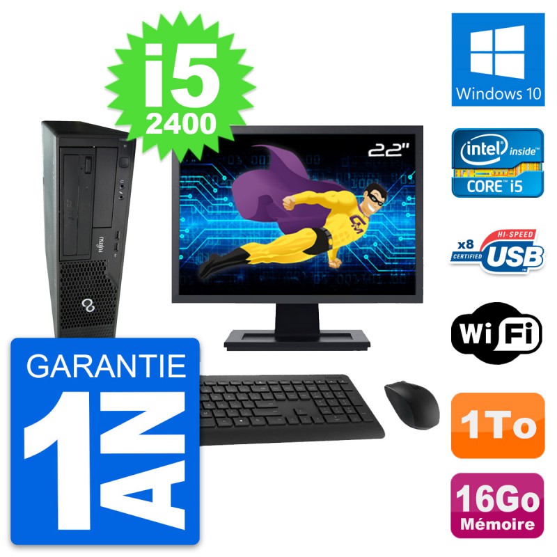 PC Fujitsu E500 DT Ecran 22" Intel i5-2400 RAM 16Go Disque 1To Windows 10 Wifi