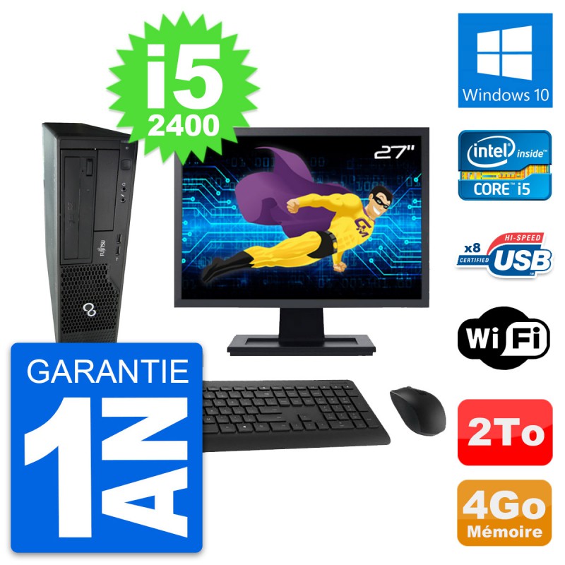 PC Fujitsu E500 DT - Intel Core i5-2400 3.1 Ghz (6 Mo) - 4 Go DDR3 - Disque Dur 3,5" 2 To - Graveur DVD - Clef Wifi USB - Windows 10 - Livré avec Ecran 27" + clavier + souris (Marques et modèles variables) - Garantie 1 an.