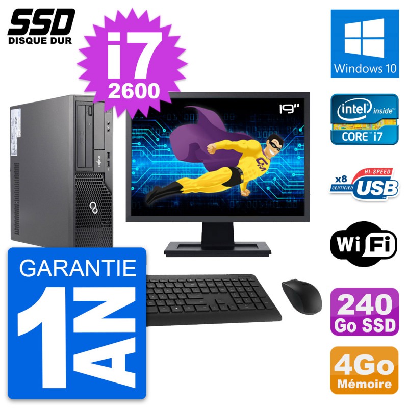 PC Fujitsu E500 DT - Intel Core i7-2600 3.4 Ghz (8 Mo) - 4 Go DDR3 - Disque Dur SSD 240 Go - Graveur DVD - Clef Wifi USB - Windows 10 - Livré avec Ecran 19" + clavier + souris (Marques et modèles variables) - Garantie 1 an.