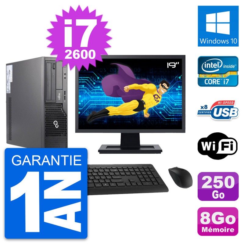 PC Fujitsu E500 DT - Intel Core i7-2600 3.4 Ghz (8 Mo) - 8 Go DDR3 - Disque Dur 3,5" 250 Go - Graveur DVD - Clef Wifi USB - Windows 10 - Livré avec Ecran 19" + clavier + souris (Marques et modèles variables) - Garantie 1 an.