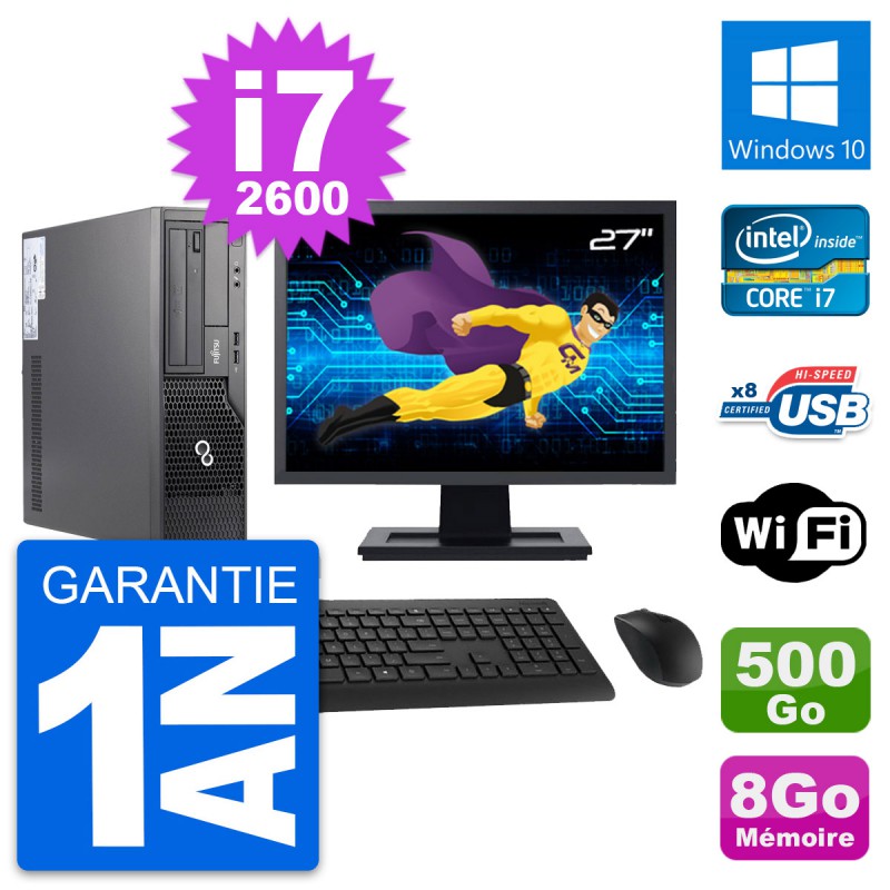 PC Fujitsu E500 DT - Intel Core i7-2600 3.4 Ghz (8 Mo) - 8 Go DDR3 - Disque Dur 3,5" 500 Go - Graveur DVD - Clef Wifi USB - Windows 10 - Livré avec Ecran 27" + clavier + souris (Marques et modèles variables) - Garantie 1 an.
