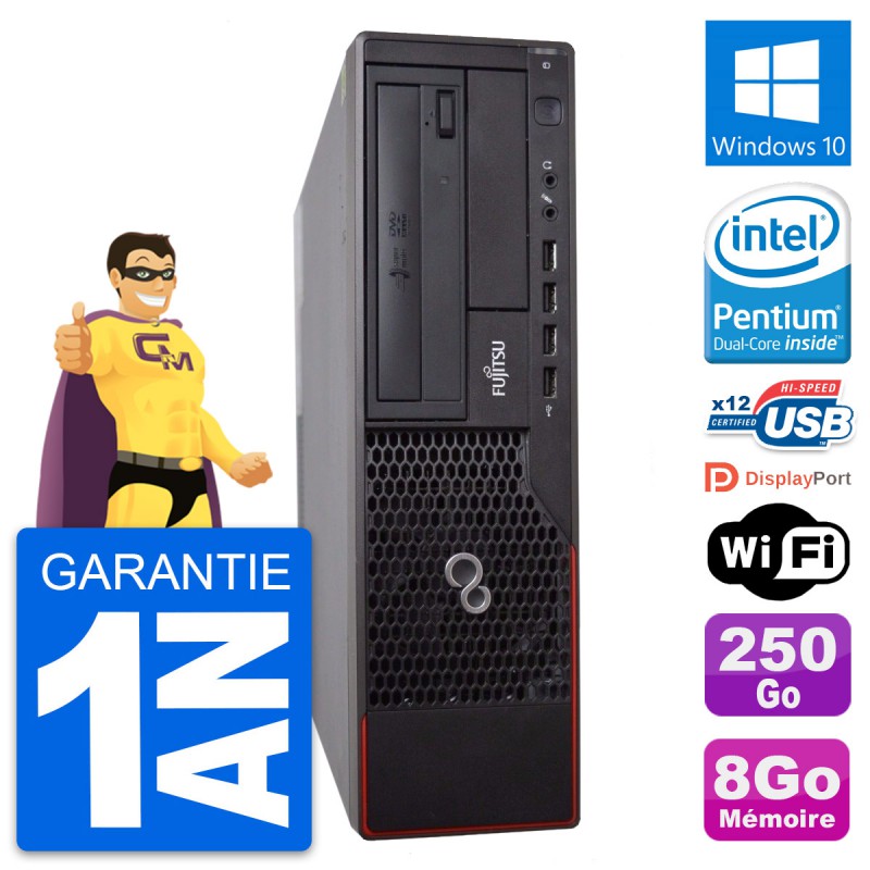PC Fujitsu Esprimo E700 DT - Intel Pentium Dual-Core G630 2.7 Ghz (3 Mo) - 8 Go DDR3 - Disque Dur 3,5" 250 Go - Graveur DVD - Clef Wifi USB - Windows 10 - Garantie 1 an.