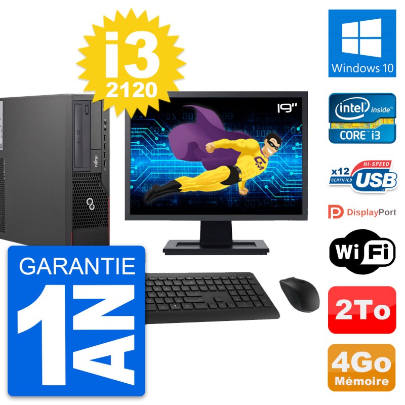 PC Fujitsu E700 DT - Intel Core i3-2120 3.3 Ghz (3 Mo) - 4 Go DDR3 - Disque Dur 3,5" 2 To - Graveur DVD - Clef Wifi USB - Windows 10 - Livré avec Ecran 19" + clavier + souris (Marques et modèles variables) - Garantie 1 an.