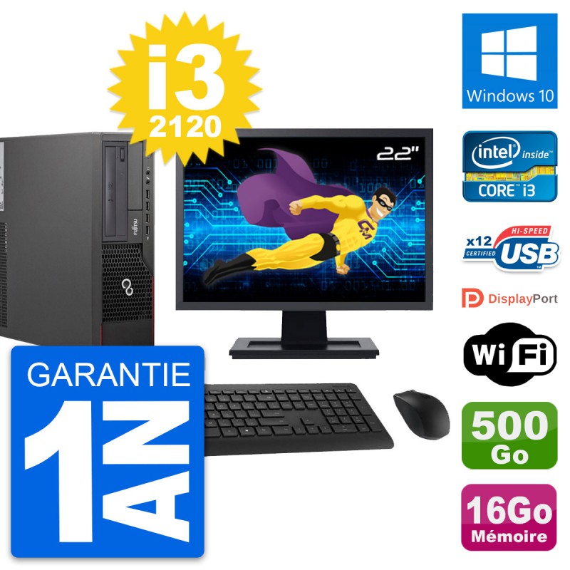 PC Fujitsu E700 DT - Intel Core i3-2120 3.3 Ghz (3 Mo) - 16 Go DDR3 - Disque Dur 3,5" 500 Go - Graveur DVD - Clef Wifi USB - Windows 10 - Livré avec Ecran 22" + clavier + souris (Marques et modèles variables) - Garantie 1 an.