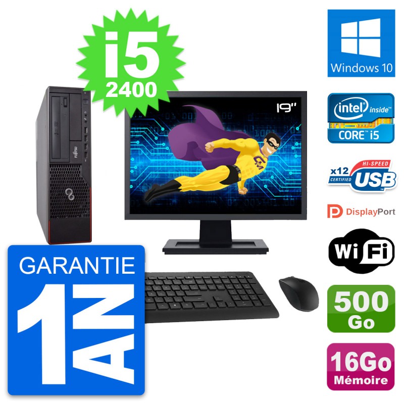 PC Fujitsu E700 DT - Intel Core i5-2400 3.1 Ghz (6 Mo) - 16 Go DDR3 - Disque Dur 3,5" 500 Go - Graveur DVD - Clef Wifi USB - Windows 10 - Livré avec Ecran 19" + clavier + souris (Marques et modèles variables) - Garantie 1 an.