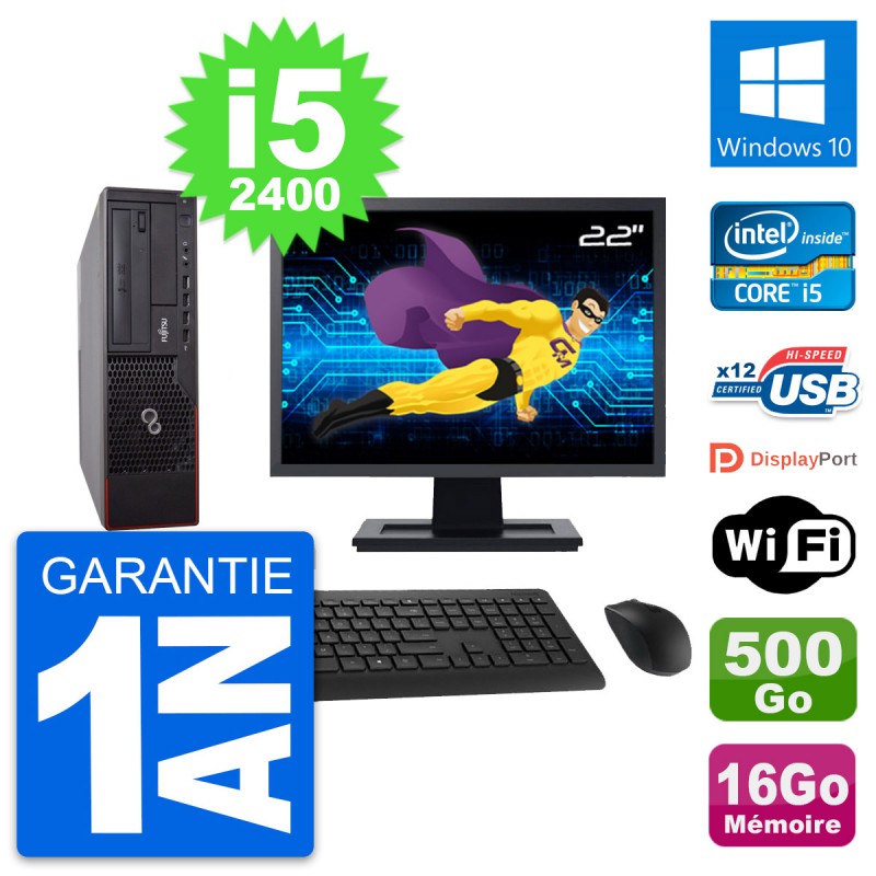 PC Fujitsu E700 DT - Intel Core i5-2400 3.1 Ghz (6 Mo) - 16 Go DDR3 - Disque Dur 3,5" 500 Go - Graveur DVD - Clef Wifi USB - Windows 10 - Livré avec Ecran 22" + clavier + souris (Marques et modèles variables) - Garantie 1 an.
