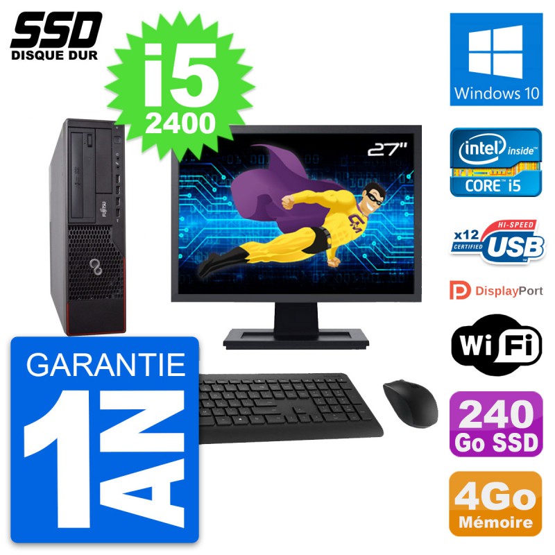PC Fujitsu E700 DT - Intel Core i5-2400 3.1 Ghz (6 Mo) - 4 Go DDR3 - Disque Dur SSD 240 Go - Graveur DVD - Clef Wifi USB - Windows 10 - Livré avec Ecran 27" + clavier + souris (Marques et modèles variables) - Garantie 1 an.