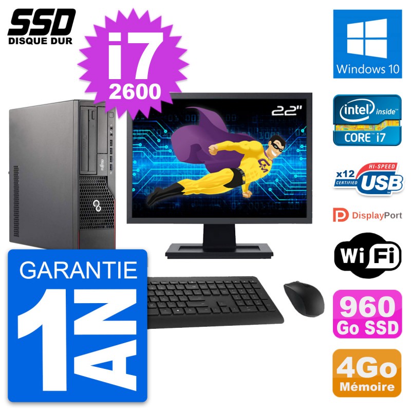 PC Fujitsu E700 DT - Intel Core i7-2600 3.4 Ghz (8 Mo) - 4 Go DDR3 - Disque Dur SSD 960 Go - Graveur DVD - Clef Wifi USB - Windows 10 - Livré avec Ecran 22" + clavier + souris (Marques et modèles variables) - Garantie 1 an.