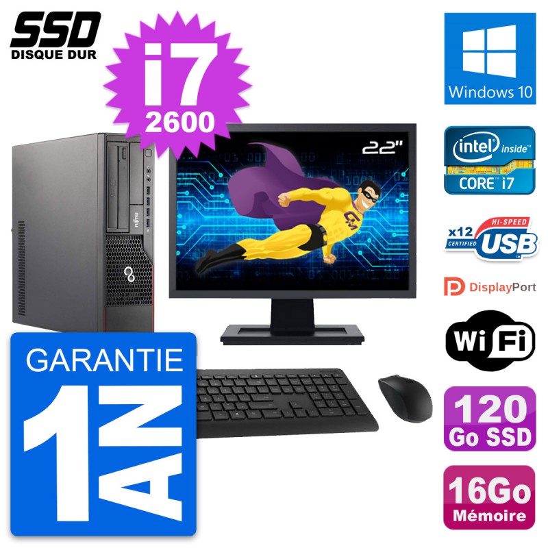 PC Fujitsu E700 DT - Intel Core i7-2600 3.4 Ghz (8 Mo) - 16 Go DDR3 - Disque Dur SSD 120 Go - Graveur DVD - Clef Wifi USB - Windows 10 - Livré avec Ecran 22" + clavier + souris (Marques et modèles variables) - Garantie 1 an.