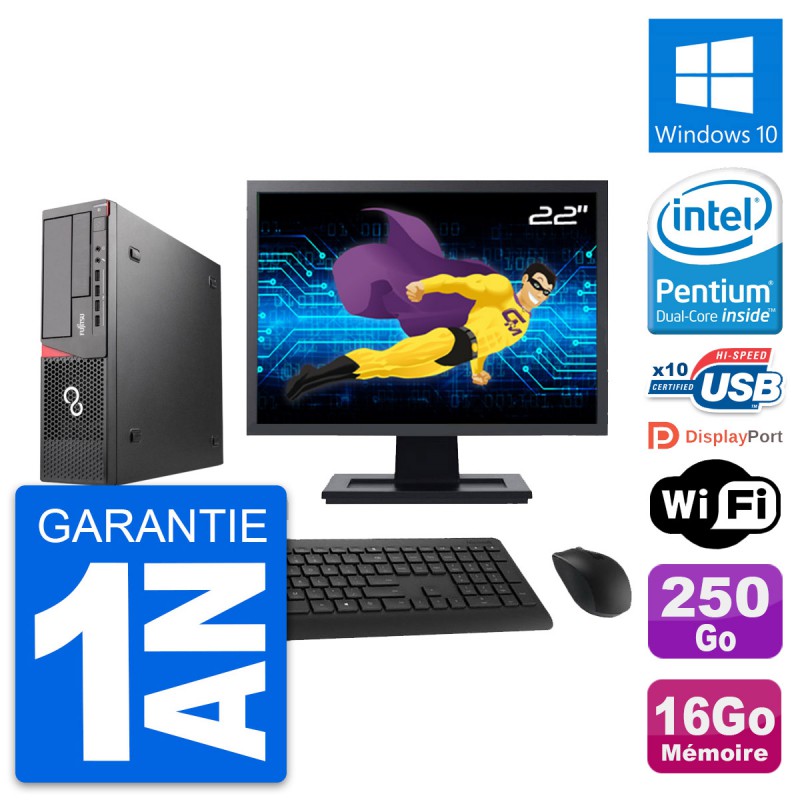 PC Fujitsu E720 DT - Intel Pentium Dual-Core G3220 3.0 Ghz (3 Mo) - 16 Go DDR3 - Disque Dur 3,5" 250 Go - Graveur DVD - Clef Wifi USB - Windows 10 - Livré avec Ecran 22" + clavier + souris (Marques et modèles variables) - Garantie 1 an.
