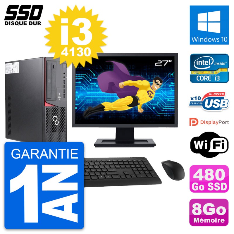 PC Fujitsu E720 DT - Intel Core i3-4130 3.4 Ghz (3 Mo) - 8 Go DDR3 - Disque Dur SSD 480 Go - Graveur DVD - Clef Wifi USB - Windows 10 - Livré avec Ecran 27" + clavier + souris (Marques et modèles variables) - Garantie 1 an.