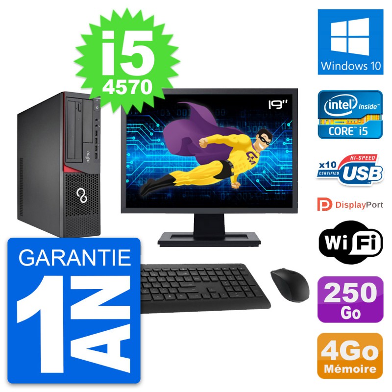 PC Fujitsu E720 DT - Intel Core i5-4570 3.2 Ghz (6 Mo) - 4 Go DDR3 - Disque Dur 3,5" 250 Go - Graveur DVD - Clef Wifi USB - Windows 10 - Livré avec Ecran 19" + clavier + souris (Marques et modèles variables) - Garantie 1 an.
