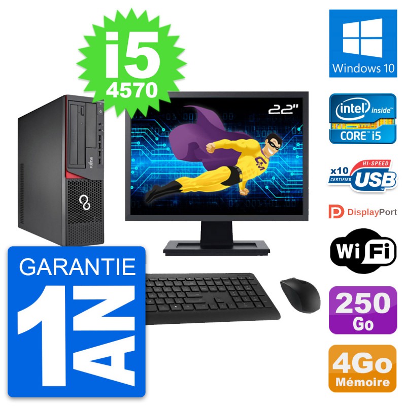 PC Fujitsu E720 DT - Intel Core i5-4570 3.2 Ghz (6 Mo) - 4 Go DDR3 - Disque Dur 3,5" 250 Go - Graveur DVD - Clef Wifi USB - Windows 10 - Livré avec Ecran 22" + clavier + souris (Marques et modèles variables) - Garantie 1 an.