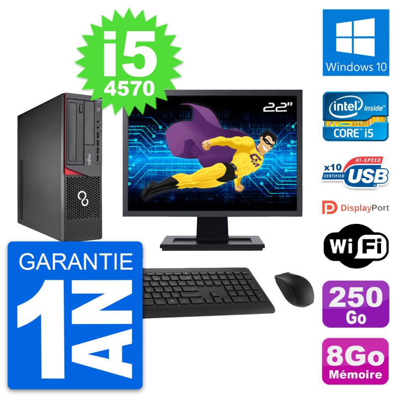 PC Fujitsu E720 DT - Intel Core i5-4570 3.2 Ghz (6 Mo) - 8 Go DDR3 - Disque Dur 3,5" 250 Go - Graveur DVD - Clef Wifi USB - Windows 10 - Livré avec Ecran 22" + clavier + souris (Marques et modèles variables) - Garantie 1 an.