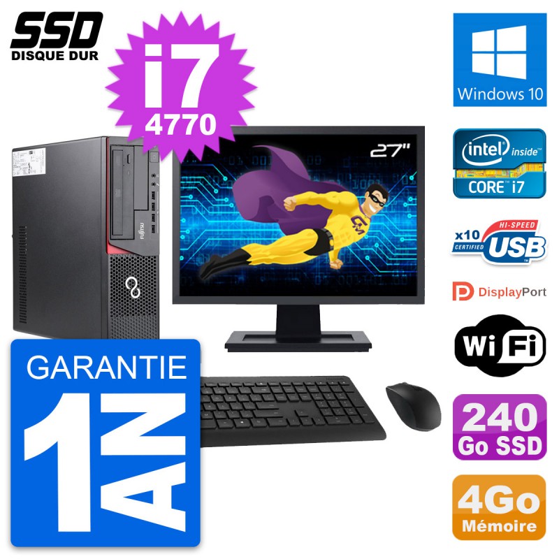PC Fujitsu E720 DT - Intel Core i7-4770 3.4 Ghz (8 Mo) - 4 Go DDR3 - Disque Dur SSD 240 Go - Graveur DVD - Clef Wifi USB - Windows 10 - Livré avec Ecran 27" + clavier + souris (Marques et modèles variables) - Garantie 1 an.