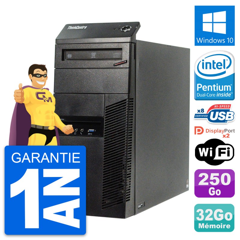 PC Tour Lenovo ThinkCentre M83 - Intel Pentium G3220 3.0 Ghz (3 Mo) - 32 Go DDR3 - Disque Dur 3,5" 250 Go - Graveur DVD - Clef Wifi USB - Windows 10 - Garantie 1 an.