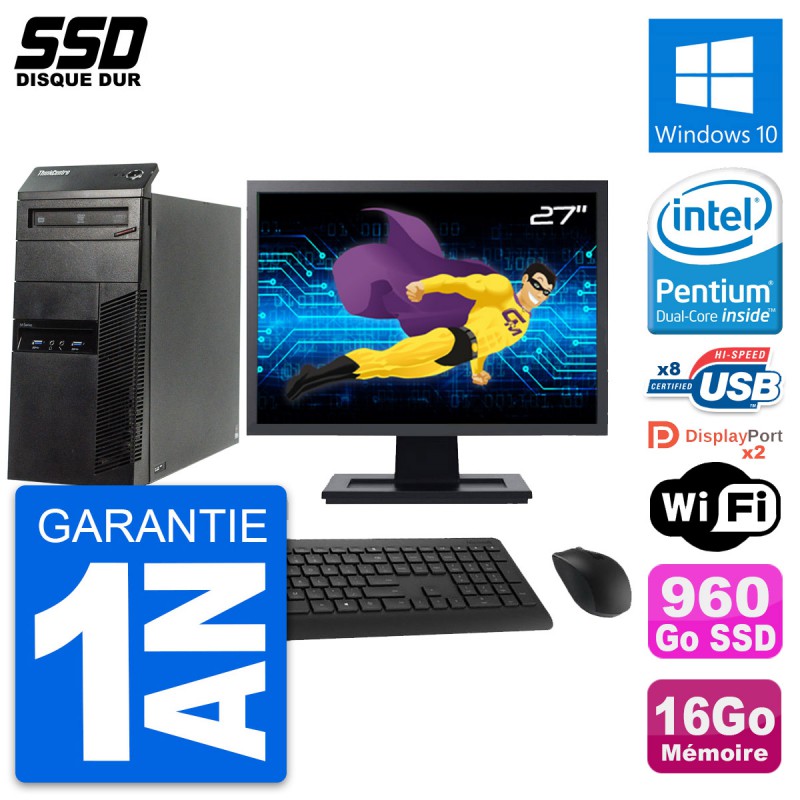 PC Tour Lenovo ThinkCentre M83 - Intel Pentium G3220 3.0 Ghz (3 Mo) - 16 Go DDR3 - Disque Dur SSD 960 Go - Graveur DVD - Clef Wifi USB - Windows 10 - Livré avec Ecran 27" + clavier + souris (Marques et modèles variables) - Garantie 1 an.