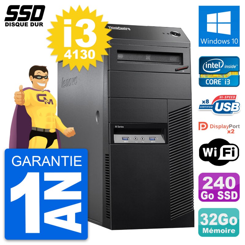 PC Tour Lenovo ThinkCentre M83 - Intel Core i3-4130 3.4 Ghz (3 Mo) - 32 Go DDR3 - Disque Dur SSD 240 Go - Graveur DVD - Clef Wifi USB - Windows 10 - Garantie 1 an.