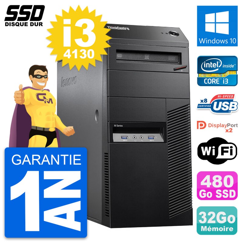 PC Tour Lenovo ThinkCentre M83 - Intel Core i3-4130 3.4 Ghz (3 Mo) - 32 Go DDR3 - Disque Dur SSD 480 Go - Graveur DVD - Clef Wifi USB - Windows 10 - Garantie 1 an.
