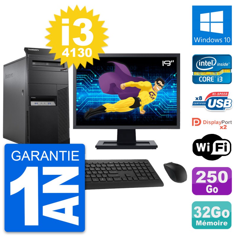 PC Tour Lenovo ThinkCentre M83 - Intel Core i3-4130 3.4 Ghz (3 Mo) - 32 Go DDR3 - Disque Dur 3,5" 250 Go - Graveur DVD - Clef Wifi USB - Windows 10 - Livré avec Ecran 19" + clavier + souris (Marques et modèles variables) - Garantie 1 an.