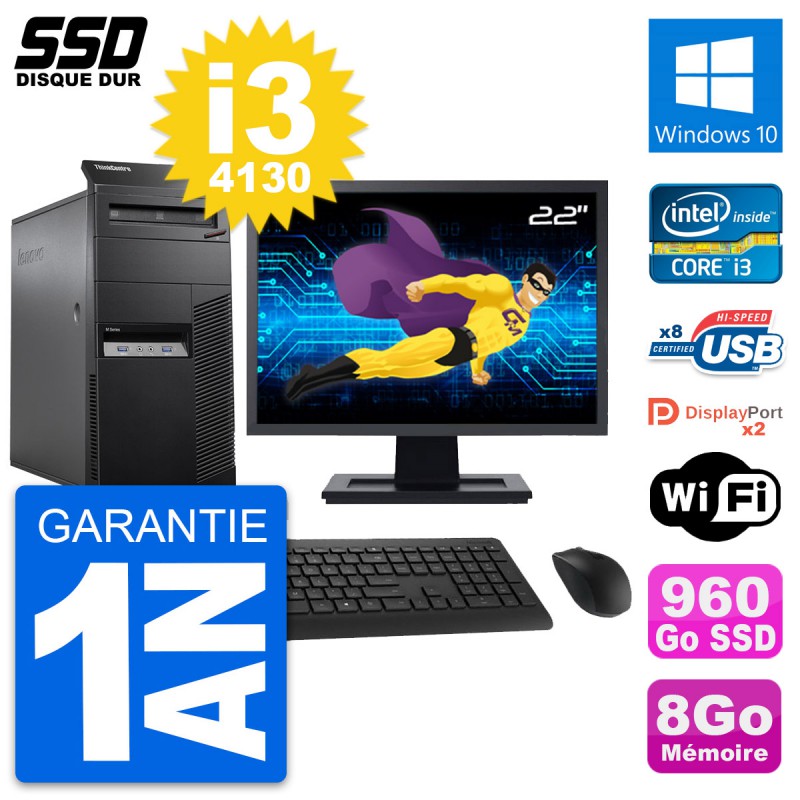 PC Tour Lenovo ThinkCentre M83 - Intel Core i3-4130 3.4 Ghz (3 Mo) - 8 Go DDR3 - Disque Dur SSD 960 Go - Graveur DVD - Clef Wifi USB - Windows 10 - Livré avec Ecran 22" + clavier + souris (Marques et modèles variables) - Garantie 1 an.