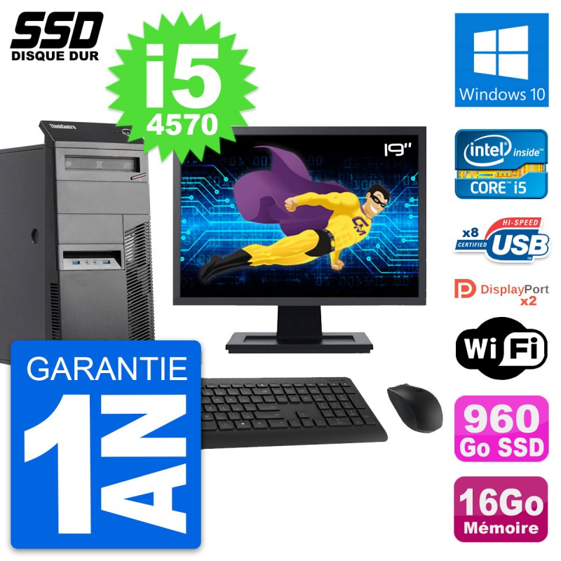 PC Tour Lenovo ThinkCentre M83 - Intel Core i5-4570 3.2 Ghz (6 Mo) - 16 Go DDR3 - Disque Dur SSD 960 Go - Graveur DVD - Clef Wifi USB - Windows 10 - Livré avec Ecran 19" + clavier + souris (Marques et modèles variables) - Garantie 1 an.