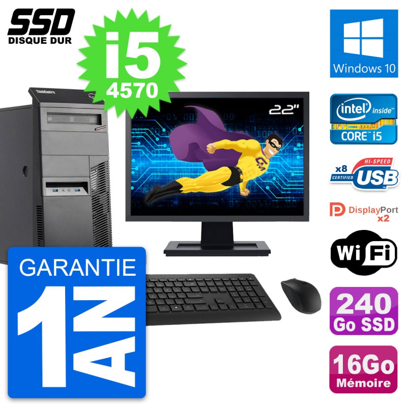 PC Tour Lenovo ThinkCentre M83 - Intel Core i5-4570 3.2 Ghz (6 Mo) - 16 Go DDR3 - Disque Dur SSD 240 Go - Graveur DVD - Clef Wifi USB - Windows 10 - Livré avec Ecran 22" + clavier + souris (Marques et modèles variables) - Garantie 1 an.