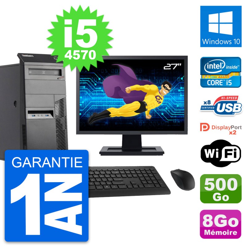 PC Tour Lenovo ThinkCentre M83 - Intel Core i5-4570 3.2 Ghz (6 Mo) - 8 Go DDR3 - Disque Dur 3,5" 500 Go - Graveur DVD - Clef Wifi USB - Windows 10 - Livré avec Ecran 27" + clavier + souris (Marques et modèles variables) - Garantie 1 an.