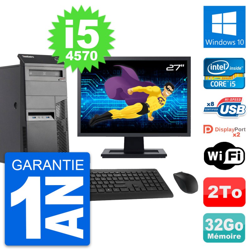 PC Tour Lenovo ThinkCentre M83 - Intel Core i5-4570 3.2 Ghz (6 Mo) - 32 Go DDR3 - Disque Dur 3,5" 2 To - Graveur DVD - Clef Wifi USB - Windows 10 - Livré avec Ecran 27" + clavier + souris (Marques et modèles variables) - Garantie 1 an.