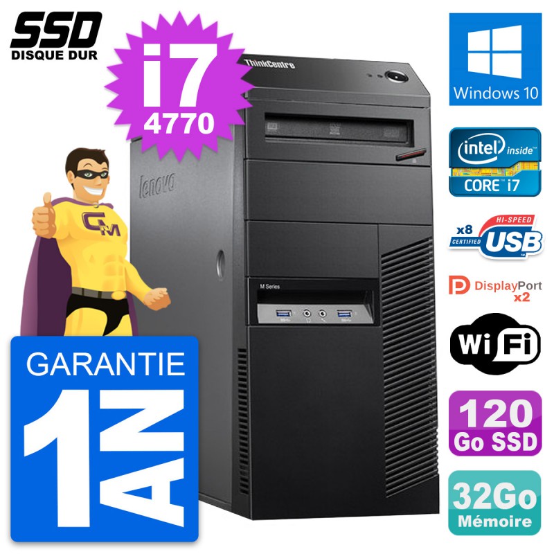 PC Tour Lenovo ThinkCentre M83 - Intel Core i7-4770 3.4 Ghz (8 Mo) - 32 Go DDR3 - Disque Dur SSD 120 Go - Graveur DVD - Clef Wifi USB - Windows 10 - Garantie 1 an.