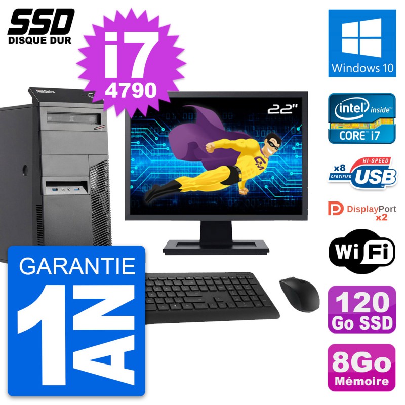 PC Tour Lenovo ThinkCentre M83 - Intel Core i7-4790 3.6 Ghz (8 Mo) - 8 Go DDR3 - Disque Dur SSD 120 Go - Graveur DVD - Clef Wifi USB - Windows 10 - Livré avec Ecran 22" + clavier + souris (Marques et modèles variables) - Garantie 1 an.