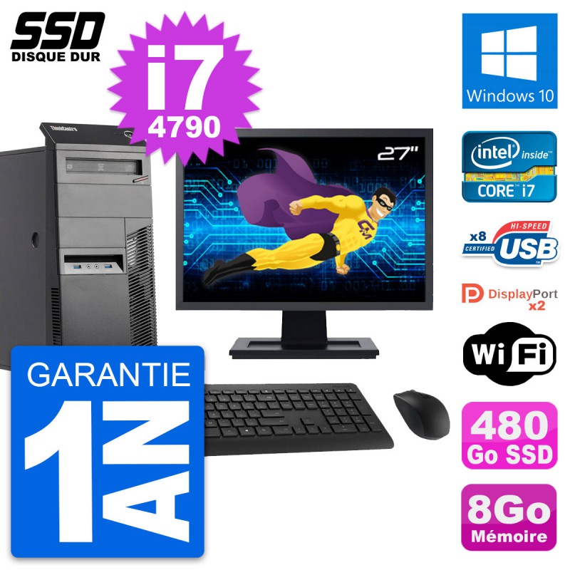 PC Tour Lenovo ThinkCentre M83 - Intel Core i7-4790 3.6 Ghz (8 Mo) - 8 Go DDR3 - Disque Dur SSD 480 Go - Graveur DVD - Clef Wifi USB - Windows 10 - Livré avec Ecran 27" + clavier + souris (Marques et modèles variables) - Garantie 1 an.