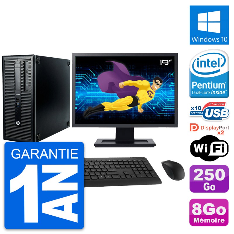 PC Tour HP ProDesk 600 G1 - Intel Pentium G3220 3.0 Ghz (3 Mo) - 8 Go DDR3 - Disque Dur 3,5" 250 Go - Graveur DVD - Clef Wifi USB - Windows 10 - Livré avec Ecran 19" + clavier + souris (Marques et modèles variables) - Garantie 1 an.