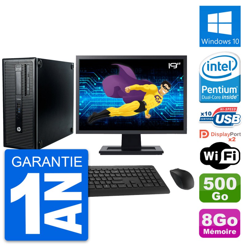 PC Tour HP ProDesk 600 G1 - Intel Pentium G3220 3.0 Ghz (3 Mo) - 8 Go DDR3 - Disque Dur 3,5" 500 Go - Graveur DVD - Clef Wifi USB - Windows 10 - Livré avec Ecran 19" + clavier + souris (Marques et modèles variables) - Garantie 1 an.