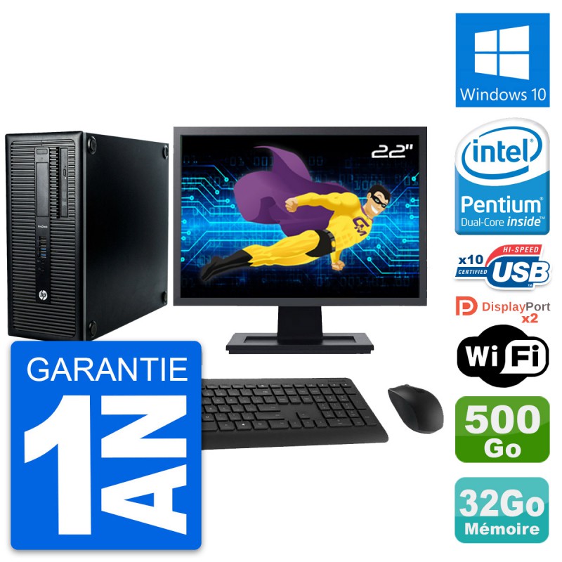 PC Tour HP ProDesk 600 G1 - Intel Pentium G3220 3.0 Ghz (3 Mo) - 32 Go DDR3 - Disque Dur 3,5" 500 Go - Graveur DVD - Clef Wifi USB - Windows 10 - Livré avec Ecran 22" + clavier + souris (Marques et modèles variables) - Garantie 1 an.