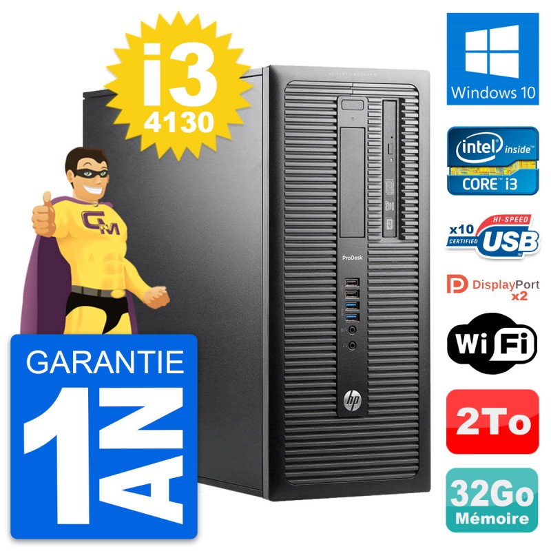 PC Tour HP ProDesk 600 G1 - Intel Core i3-4130 3.4 Ghz (3 Mo) - 32 Go DDR3 - Disque Dur 3,5" 2 To - Graveur DVD - Clef Wifi USB - Windows 10 - Garantie 1 an.
