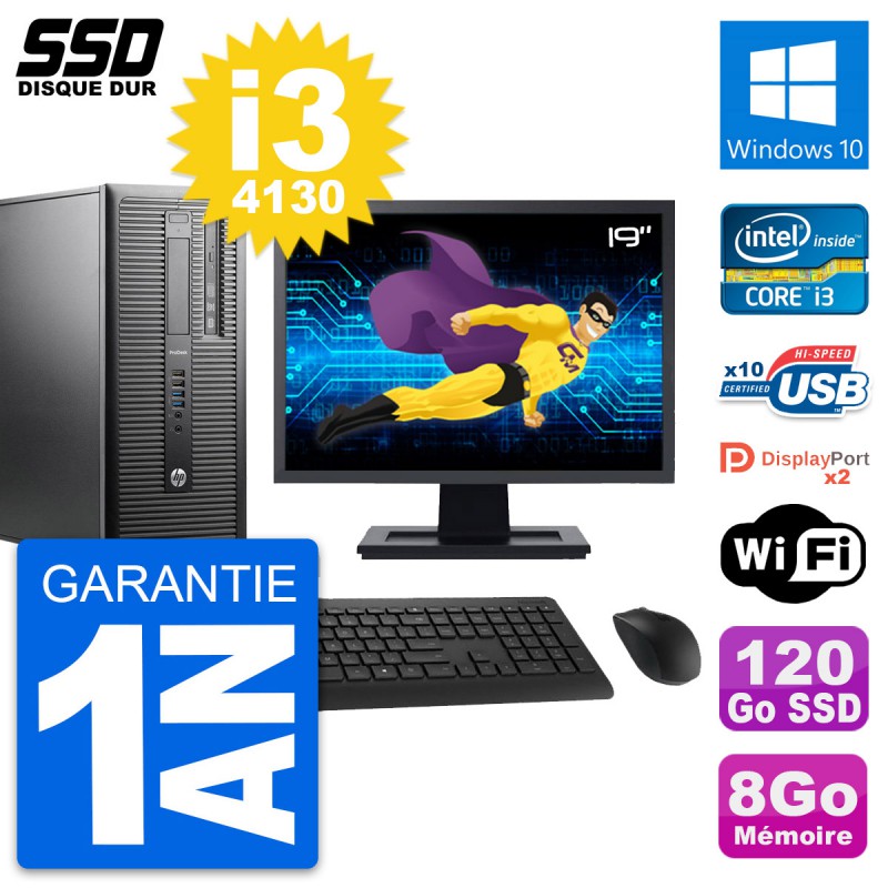 PC Tour HP ProDesk 600 G1 - Intel Core i3-4130 3.4 Ghz (3 Mo) - 8 Go DDR3 - Disque Dur SSD 120 Go - Graveur DVD - Clef Wifi USB - Windows 10 - Livré avec Ecran 19" + clavier + souris (Marques et modèles variables) - Garantie 1 an.