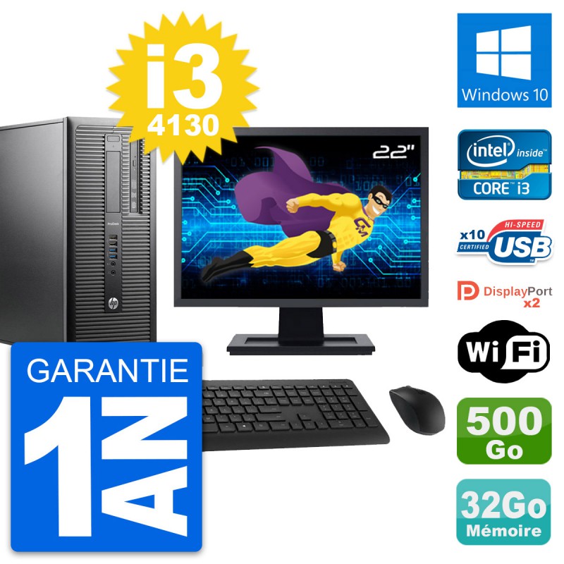 PC Tour HP ProDesk 600 G1 - Intel Core i3-4130 3.4 Ghz (3 Mo) - 32 Go DDR3 - Disque Dur 3,5" 500 Go - Graveur DVD - Clef Wifi USB - Windows 10 - Livré avec Ecran 22" + clavier + souris (Marques et modèles variables) - Garantie 1 an.