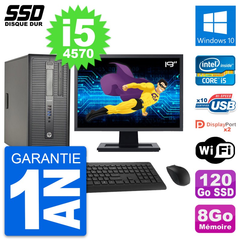 PC Tour HP ProDesk 600 G1 - Intel Core i5-4570 3.2 Ghz (6 Mo) - 8 Go DDR3 - Disque Dur SSD 120 Go - Graveur DVD - Clef Wifi USB - Windows 10 - Livré avec Ecran 19" + clavier + souris (Marques et modèles variables) - Garantie 1 an.