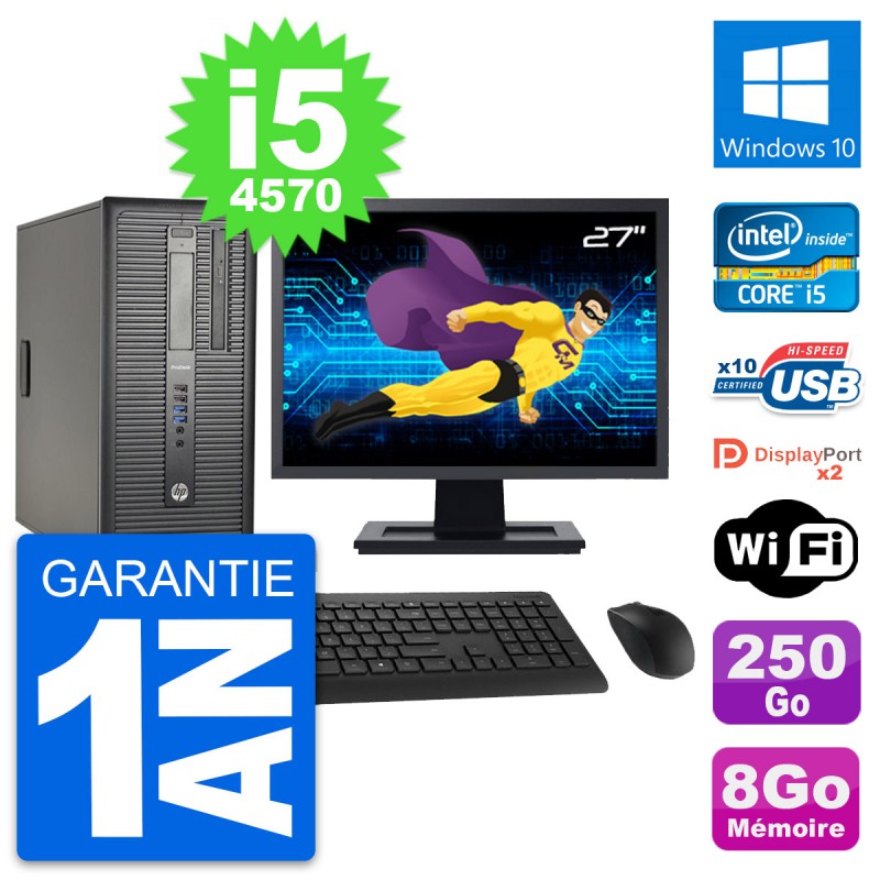 PC Tour HP ProDesk 600 G1 - Intel Core i5-4570 3.2 Ghz (6 Mo) - 8 Go DDR3 - Disque Dur 3,5" 250 Go - Graveur DVD - Clef Wifi USB - Windows 10 - Livré avec Ecran 27" + clavier + souris (Marques et modèles variables) - Garantie 1 an.