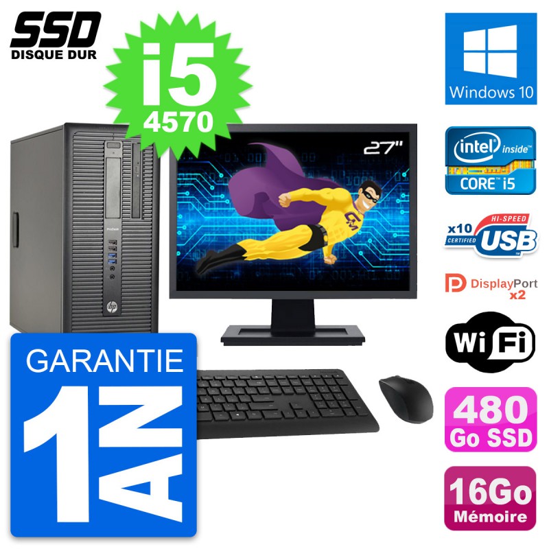 PC Tour HP ProDesk 600 G1 - Intel Core i5-4570 3.2 Ghz (6 Mo) - 16 Go DDR3 - Disque Dur SSD 480 Go - Graveur DVD - Clef Wifi USB - Windows 10 - Livré avec Ecran 27" + clavier + souris (Marques et modèles variables) - Garantie 1 an.