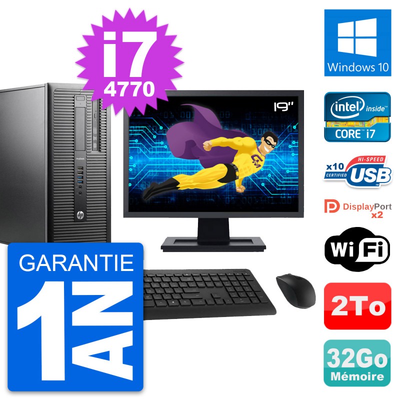 PC Tour HP ProDesk 600 G1 - Intel Core i7-4770 3.4 Ghz (8 Mo) - 32 Go DDR3 - Disque Dur 3,5" 2 To - Graveur DVD - Clef Wifi USB - Windows 10 - Livré avec Ecran 19" + clavier + souris (Marques et modèles variables) - Garantie 1 an.