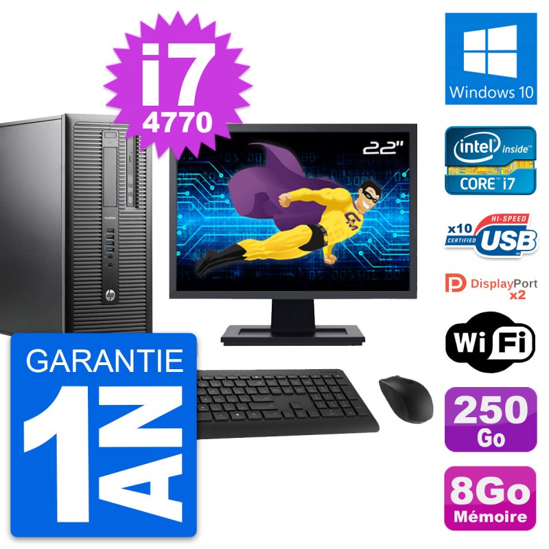 PC Tour HP ProDesk 600 G1 - Intel Core i7-4770 3.4 Ghz (8 Mo) - 8 Go DDR3 - Disque Dur 3,5" 250 Go - Graveur DVD - Clef Wifi USB - Windows 10 - Livré avec Ecran 22" + clavier + souris (Marques et modèles variables) - Garantie 1 an.
