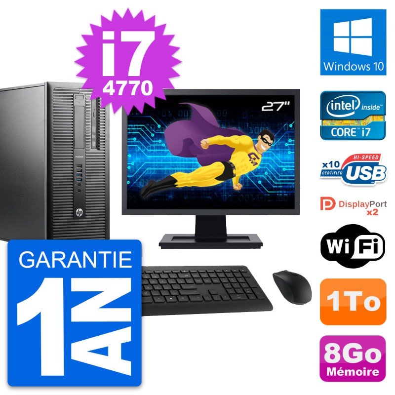 PC Tour HP ProDesk 600 G1 - Intel Core i7-4770 3.4 Ghz (8 Mo) - 8 Go DDR3 - Disque Dur 3,5" 1 To - Graveur DVD - Clef Wifi USB - Windows 10 - Livré avec Ecran 27" + clavier + souris (Marques et modèles variables) - Garantie 1 an.