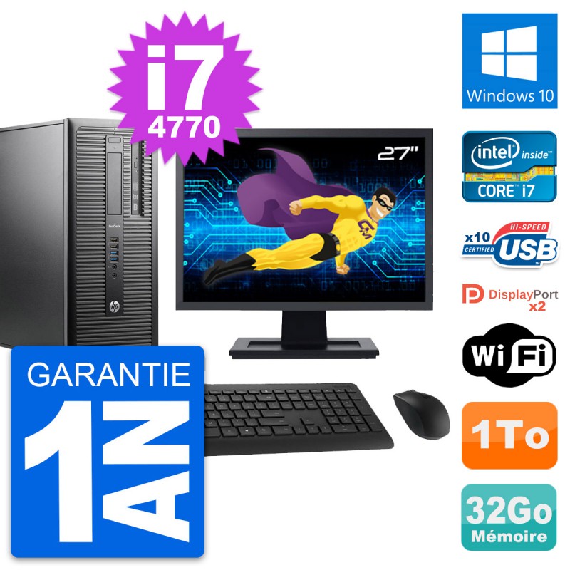 PC Tour HP ProDesk 600 G1 - Intel Core i7-4770 3.4 Ghz (8 Mo) - 32 Go DDR3 - Disque Dur 3,5" 1 To - Graveur DVD - Clef Wifi USB - Windows 10 - Livré avec Ecran 27" + clavier + souris (Marques et modèles variables) - Garantie 1 an.