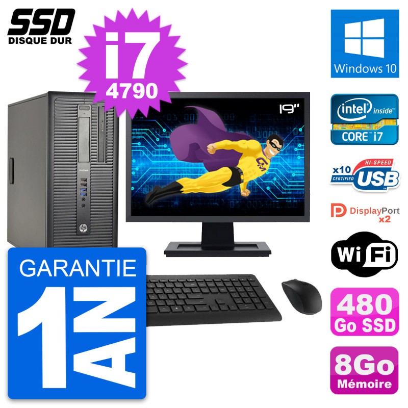 PC Tour HP ProDesk 600 G1 - Intel Core i7-4790 3.6 Ghz (8 Mo) - 8 Go DDR3 - Disque Dur SSD 480 Go - Graveur DVD - Clef Wifi USB - Windows 10 - Livré avec Ecran 19" + clavier + souris (Marques et modèles variables) - Garantie 1 an.