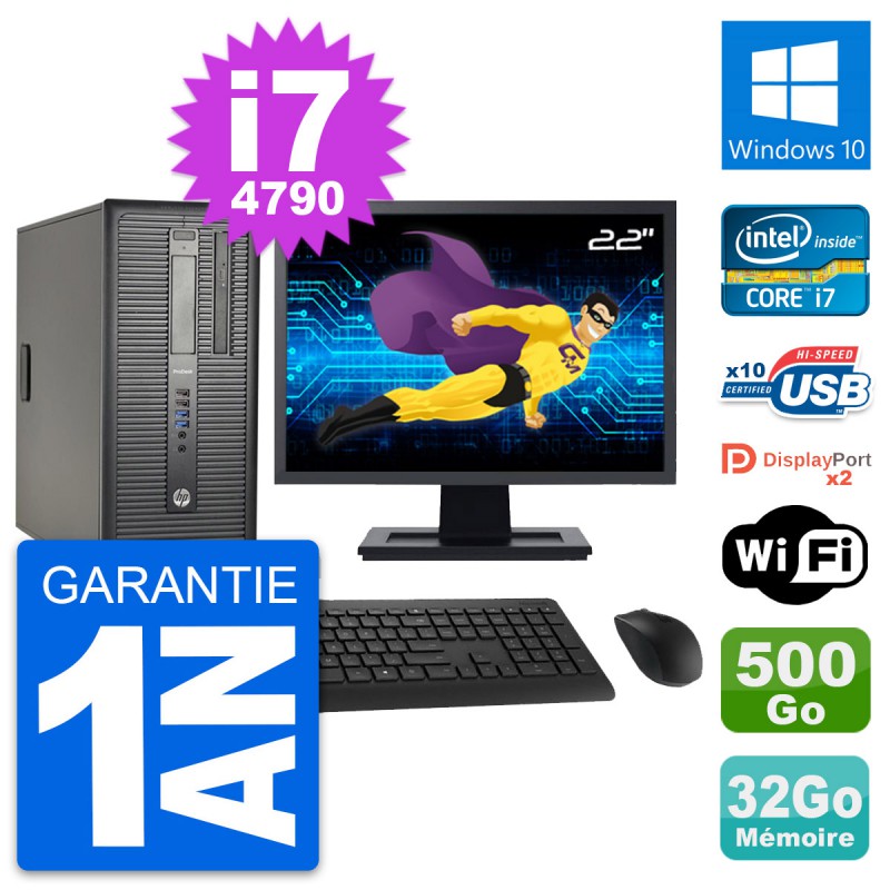 PC Tour HP ProDesk 600 G1 - Intel Core i7-4790 3.6 Ghz (8 Mo) - 32 Go DDR3 - Disque Dur 3,5" 500 Go - Graveur DVD - Clef Wifi USB - Windows 10 - Livré avec Ecran 22" + clavier + souris (Marques et modèles variables) - Garantie 1 an.