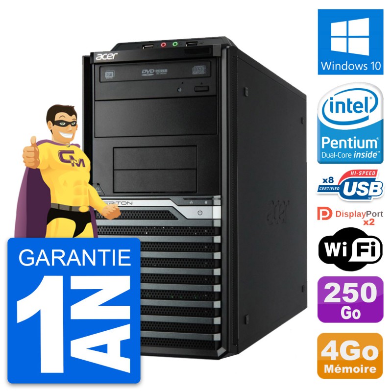 PC Tour Acer Veriton M4630G - Intel Pentium Dual-Core G3220 3.0 Ghz (3 Mo) - 4 Go DDR3 - Disque Dur 3,5" 250 Go - Graveur DVD - Clef Wifi USB - Windows 10 - Garantie 1 an.