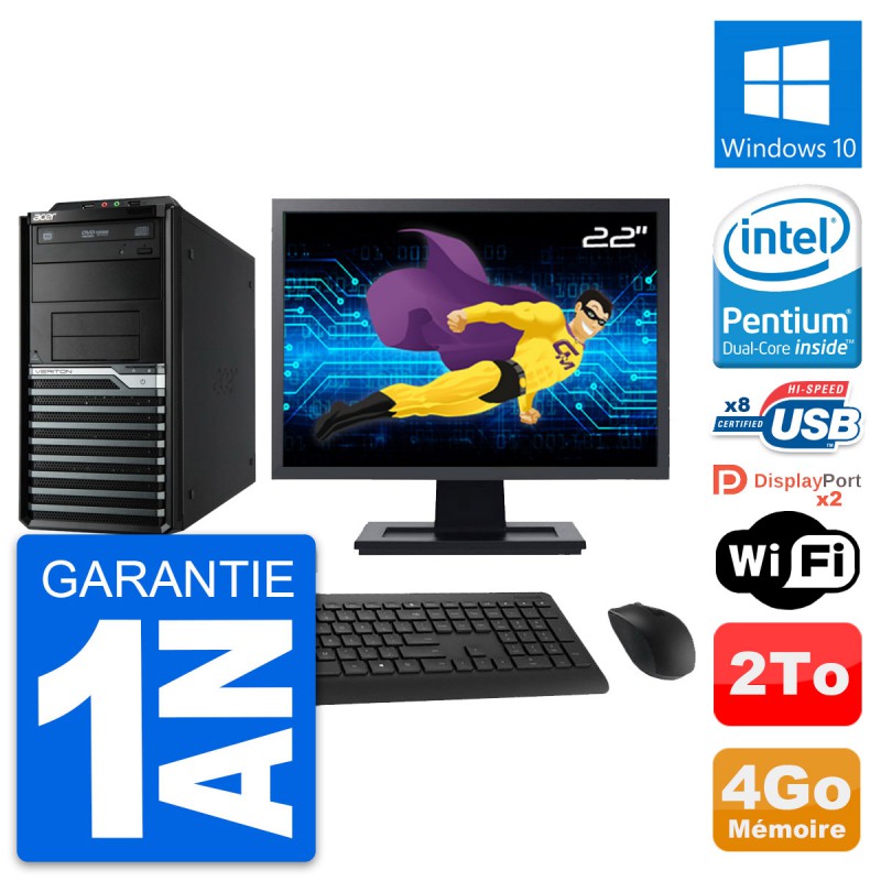 PC Tour Acer M4630G - Intel Pentium Dual-Core G3220 3.0 Ghz (3 Mo) - 4 Go DDR3 - Disque Dur 3,5" 2 To - Graveur DVD - Clef Wifi USB - Windows 10 - Livré avec Ecran 22" + clavier + souris (Marques et modèles variables) - Garantie 1 an.
