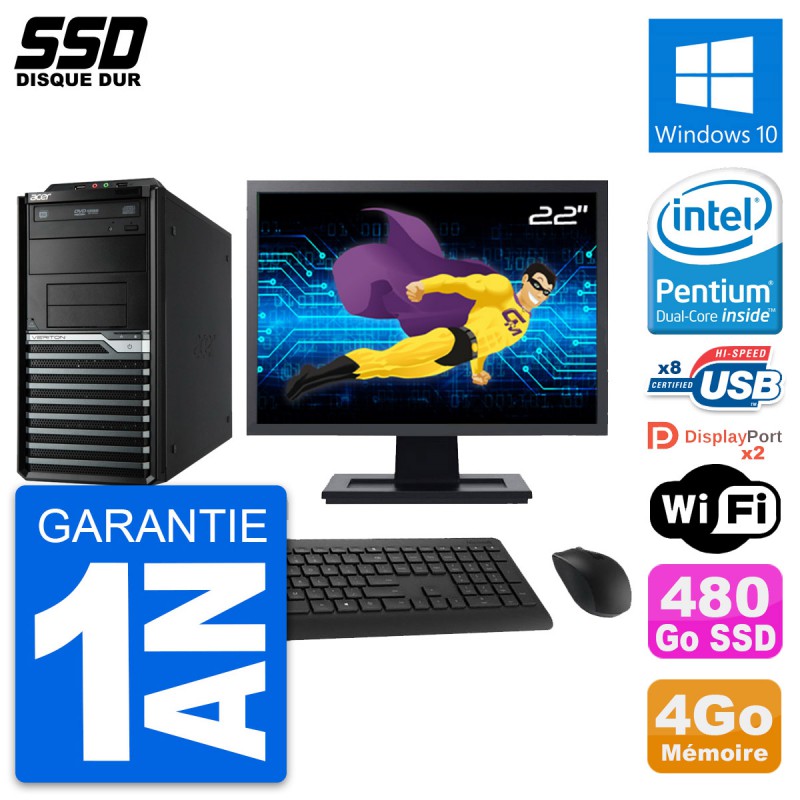 PC Tour Acer M4630G - Intel Pentium Dual-Core G3220 3.0 Ghz (3 Mo) - 4 Go DDR3 - Disque Dur SSD 480 Go - Graveur DVD - Clef Wifi USB - Windows 10 - Livré avec Ecran 22" + clavier + souris (Marques et modèles variables) - Garantie 1 an.